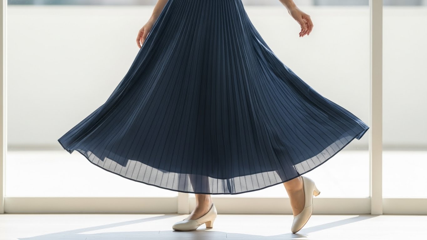 縦ラインを強調できる細プリーツと落ち感素材を選べば、印象は大きく変わります。