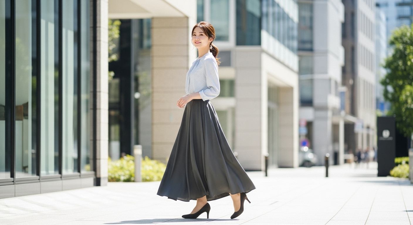 足元が軽やかになると、ロングスカートの重さを感じさせません。