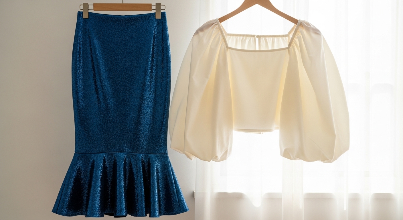 ボリューム袖のトップスとマーメイドスカートの組み合わせは、避けましょう...。