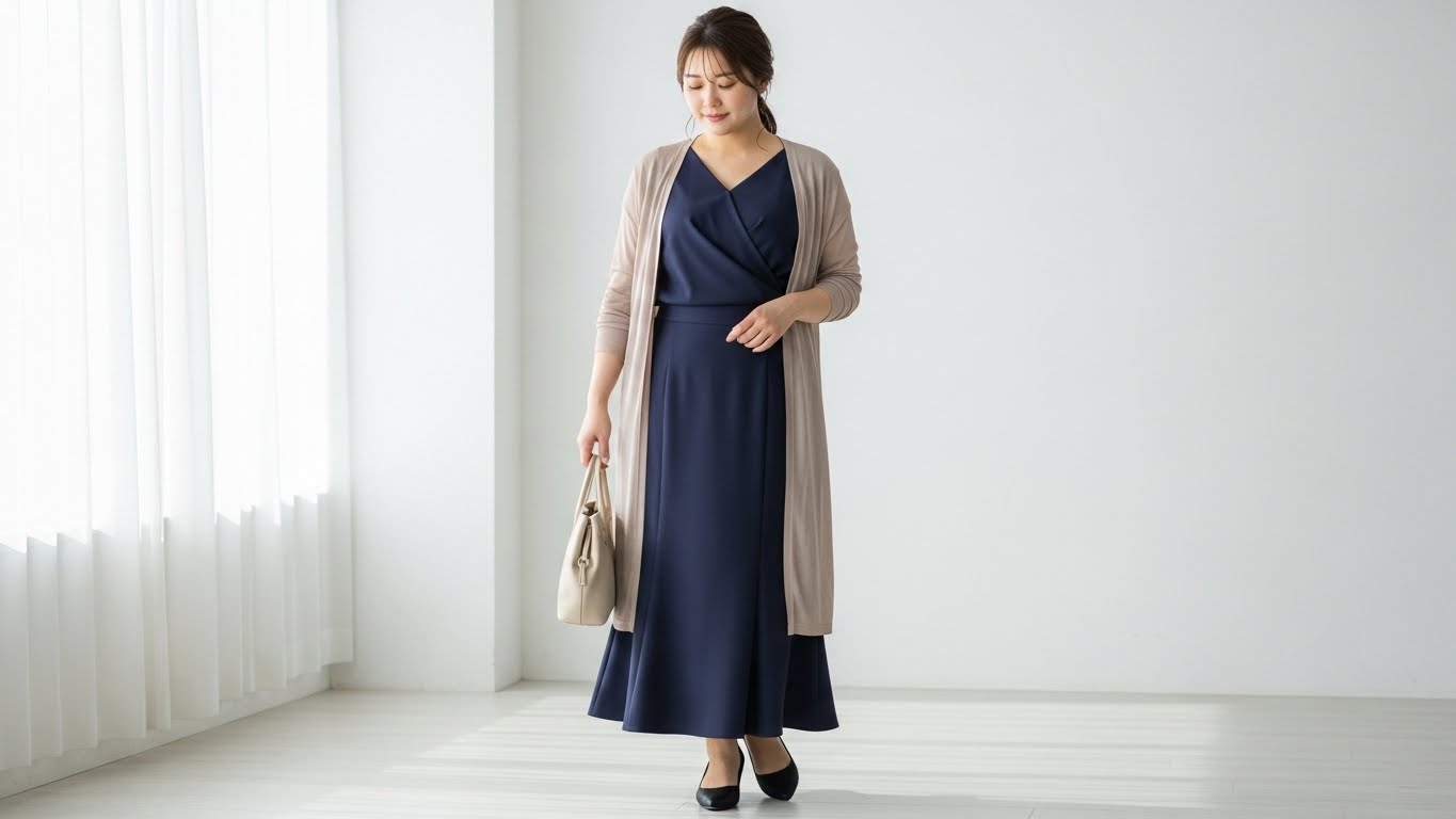 ロング丈のカーディガンを羽織れば、さらに縦のラインが強調されて細見え効果アップ!