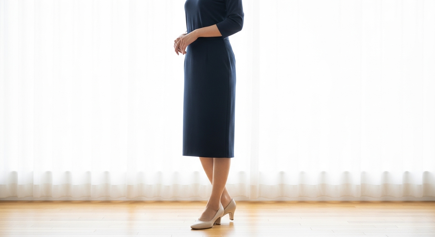 タイトスカートにはパンプスが定番ですが、高すぎるヒールは避けましょう。