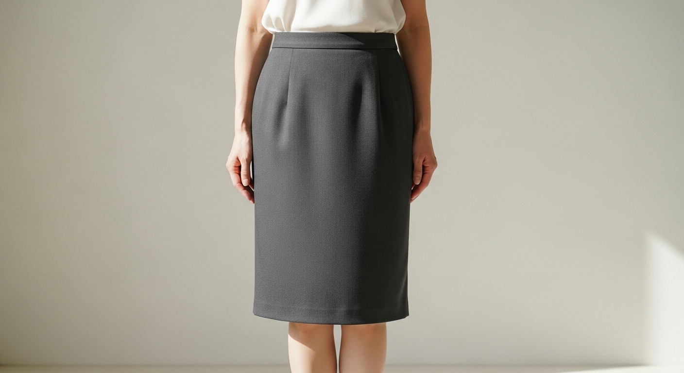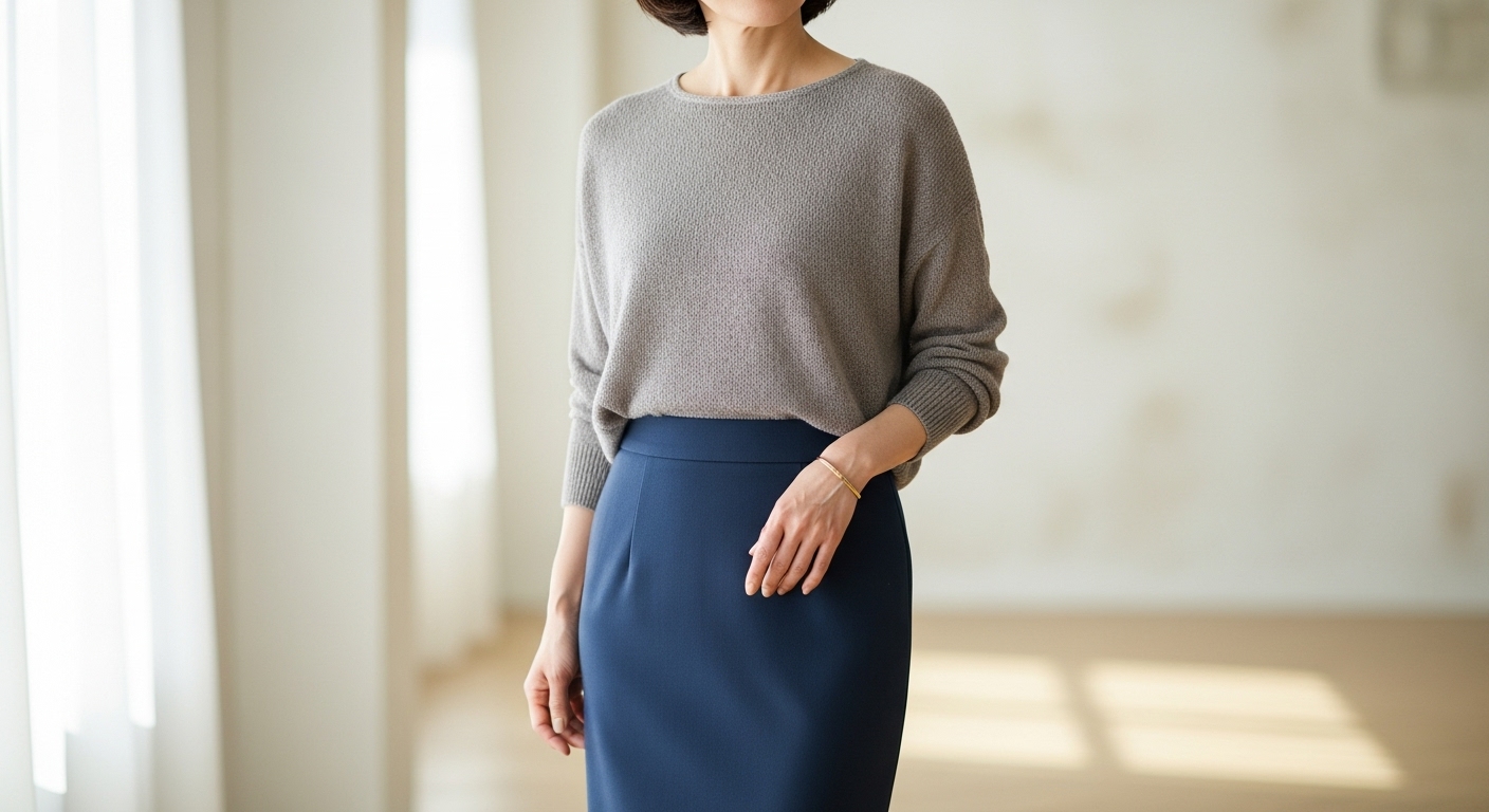 ネイビーやチャコールグレーのタイトスカートに、白やベージュのブラウスを合わせると、清潔感のあるオフィススタイルになります。