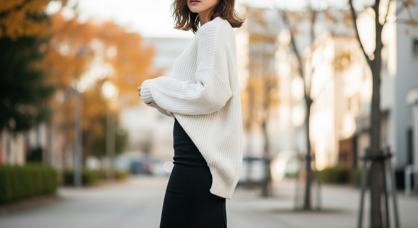 ニットの優しさとタイトスカートの女性らしさが相まって、デートにぴったりの雰囲気になります。