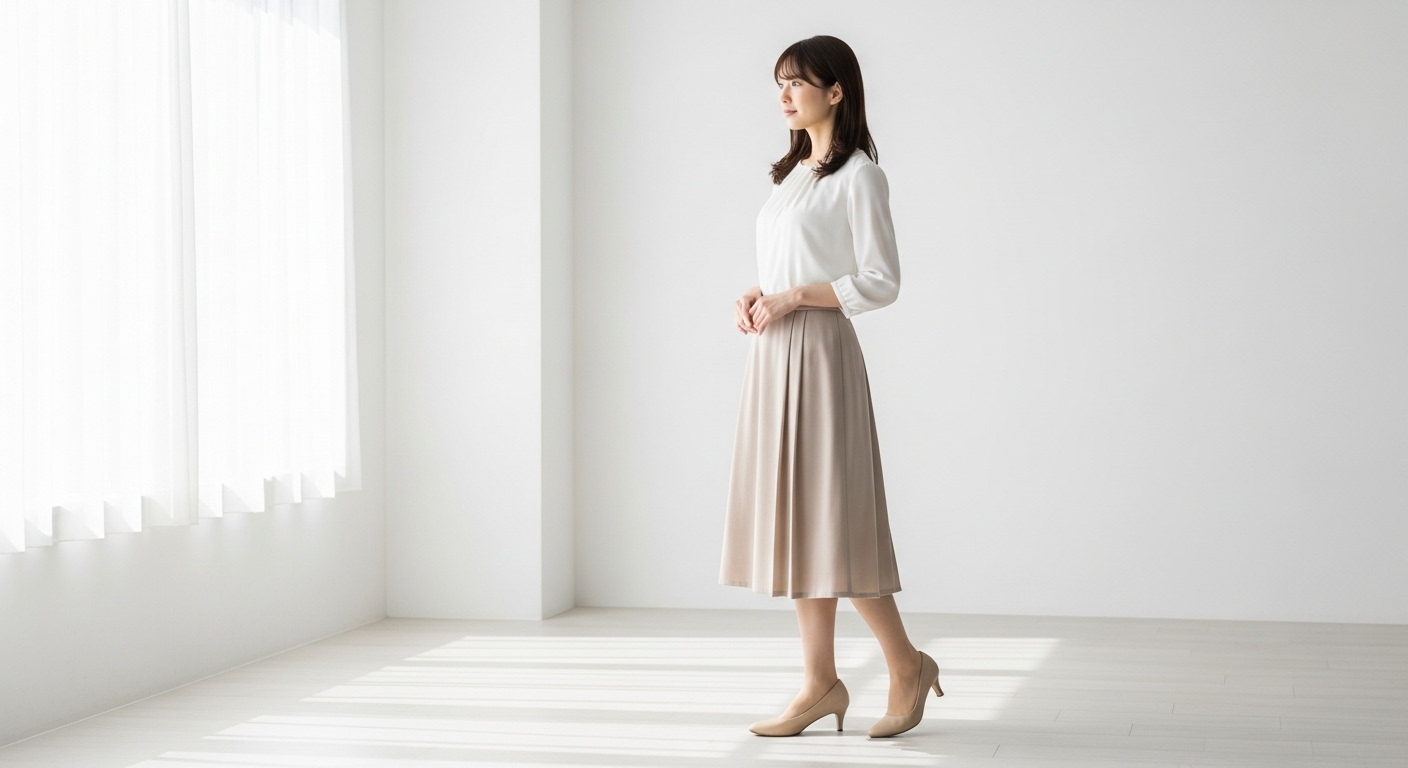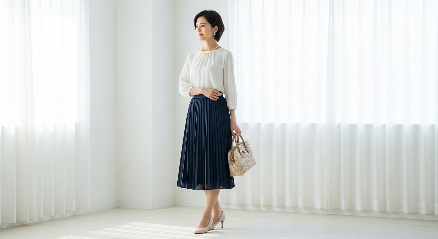 シンプルなデザインを選べば、プリーツスカートの上品さを損ないません。