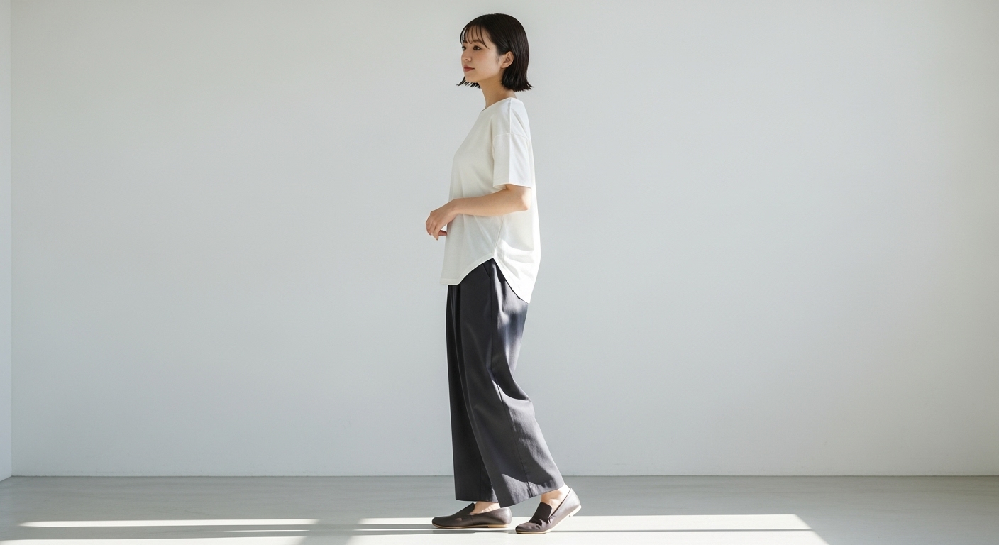 ボトムスの丈は、足首が少し見える程度がちょうどいい長さ。