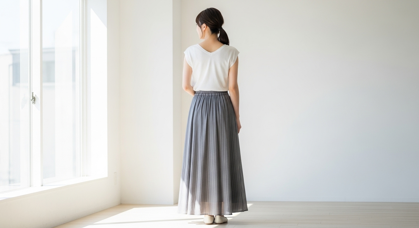 細身のパンツやIラインのワンピースなど、横に広がらないデザインを選ぶと、自然に縦の印象が強まります。