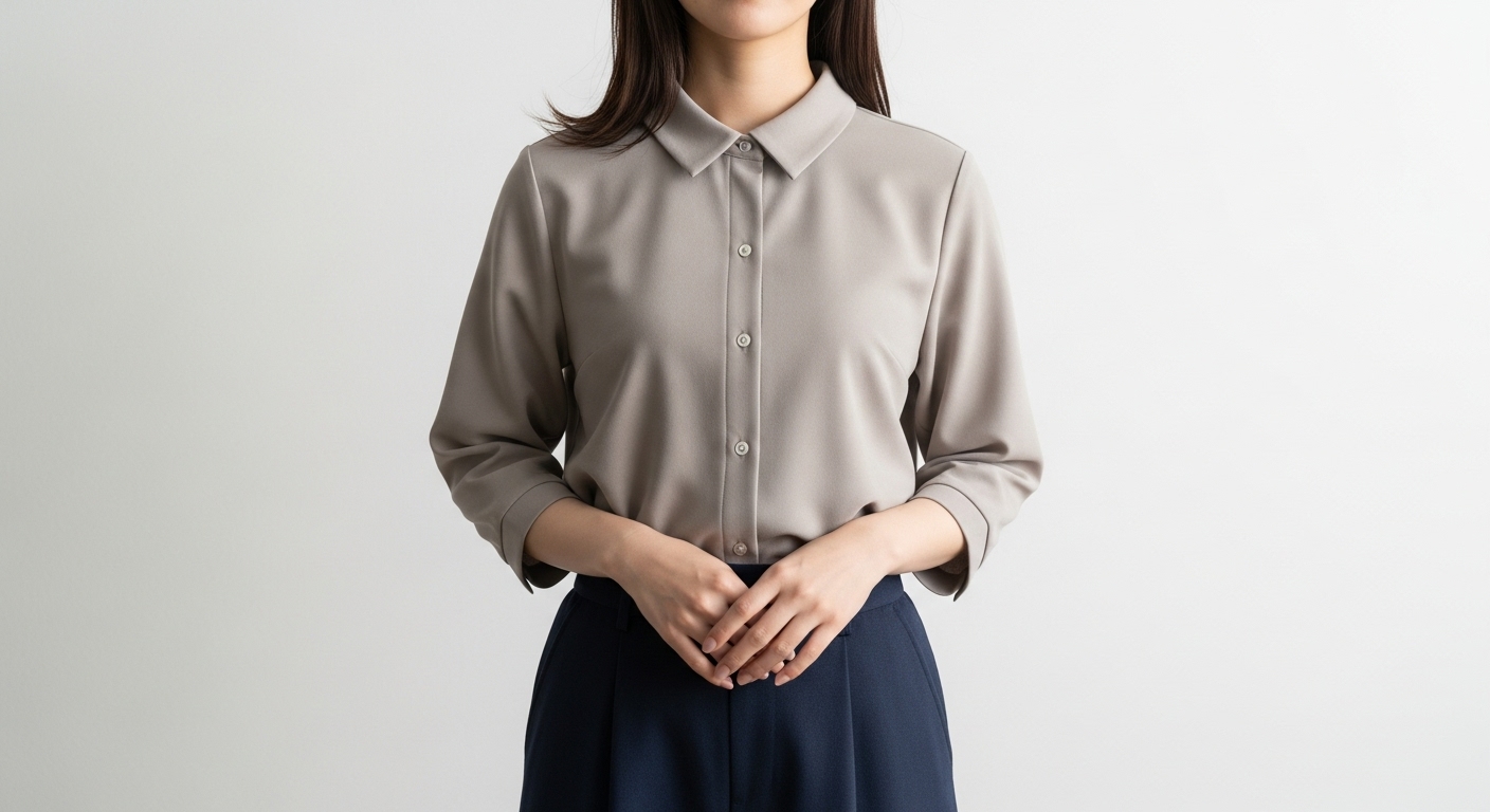 首元はVネックかクルーネックで、開きが浅すぎないものが好相性です。
