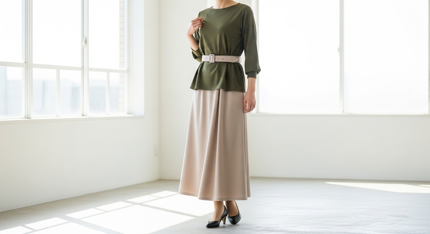ウエストマークや縦のラインを意識すれば、バランスの良いコーディネートが完成します。