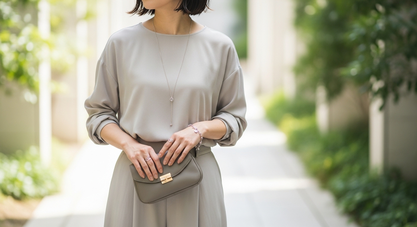 アクセサリーや小物も華奢なデザインで統一すると、全体の印象がまとまりますよ。
