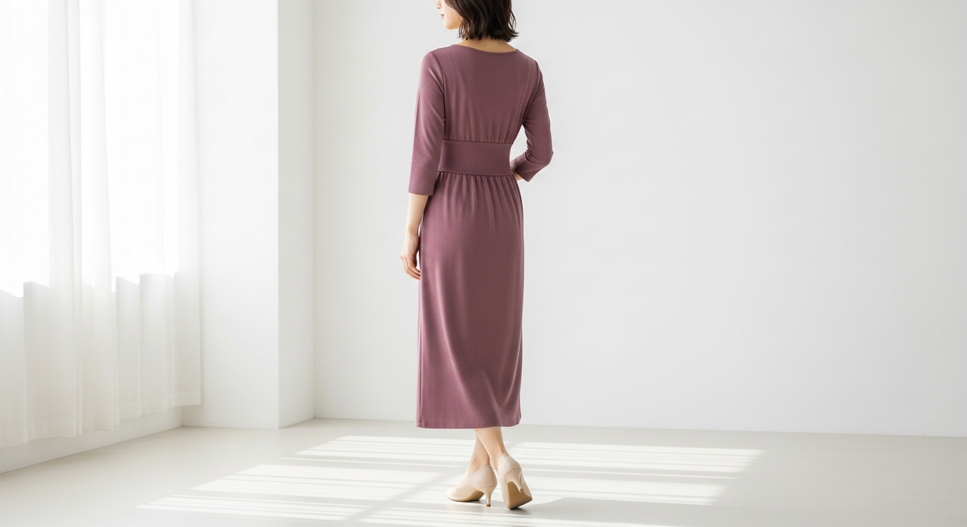 ウエストマークや縦ラインを意識すると、すっきり見えます。