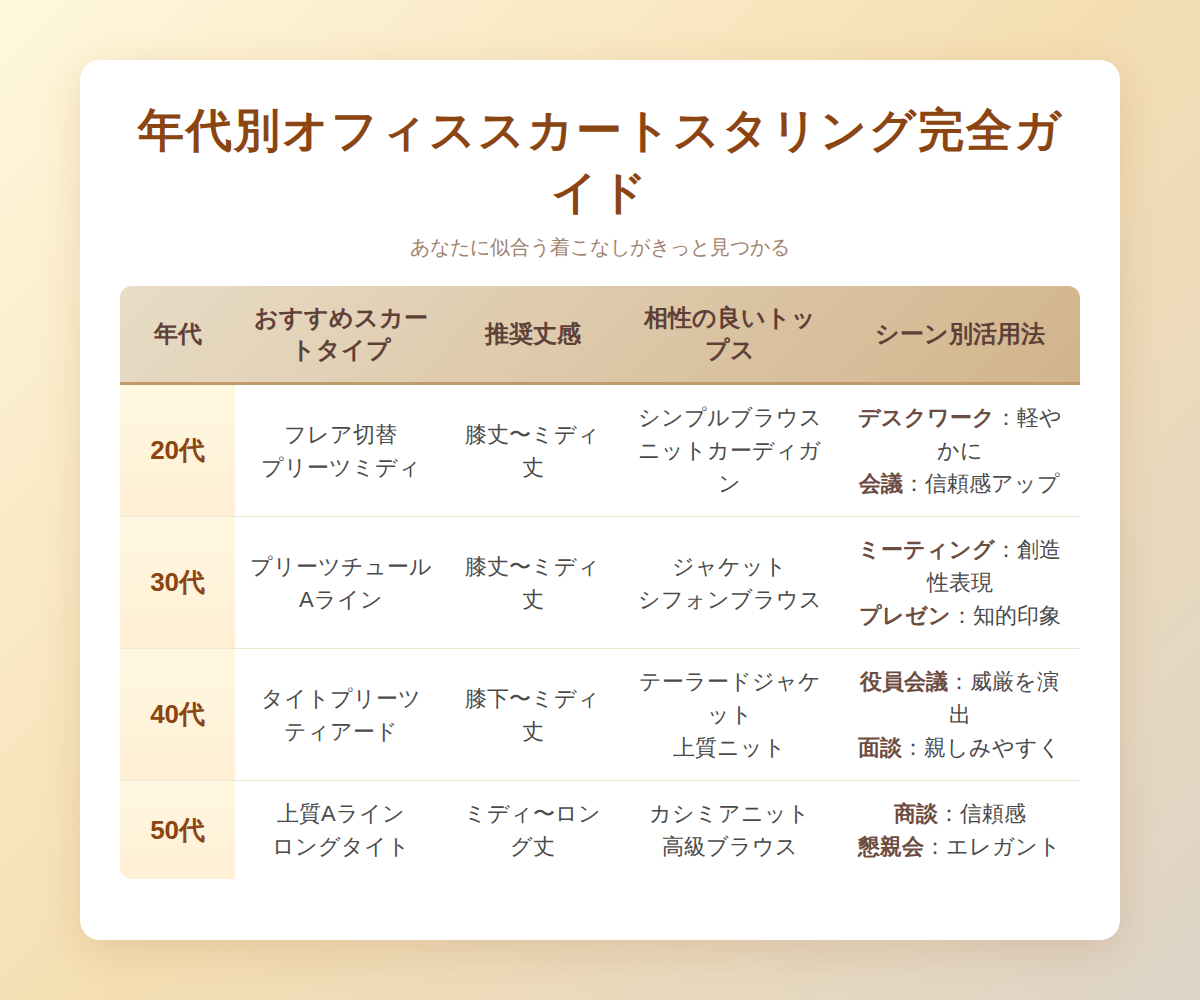 この記事では、20代から50代まで年代別のコーディネート術と、職場のシーン別スタイリングテクニックを分かりやすく解説します。