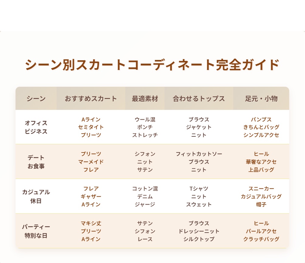 素材・丈・シルエットなど、ポイントを押さえたスカート選びをすることで、あなたの魅力を活かした理想のスタイルを手に入れることができるでしょう。
