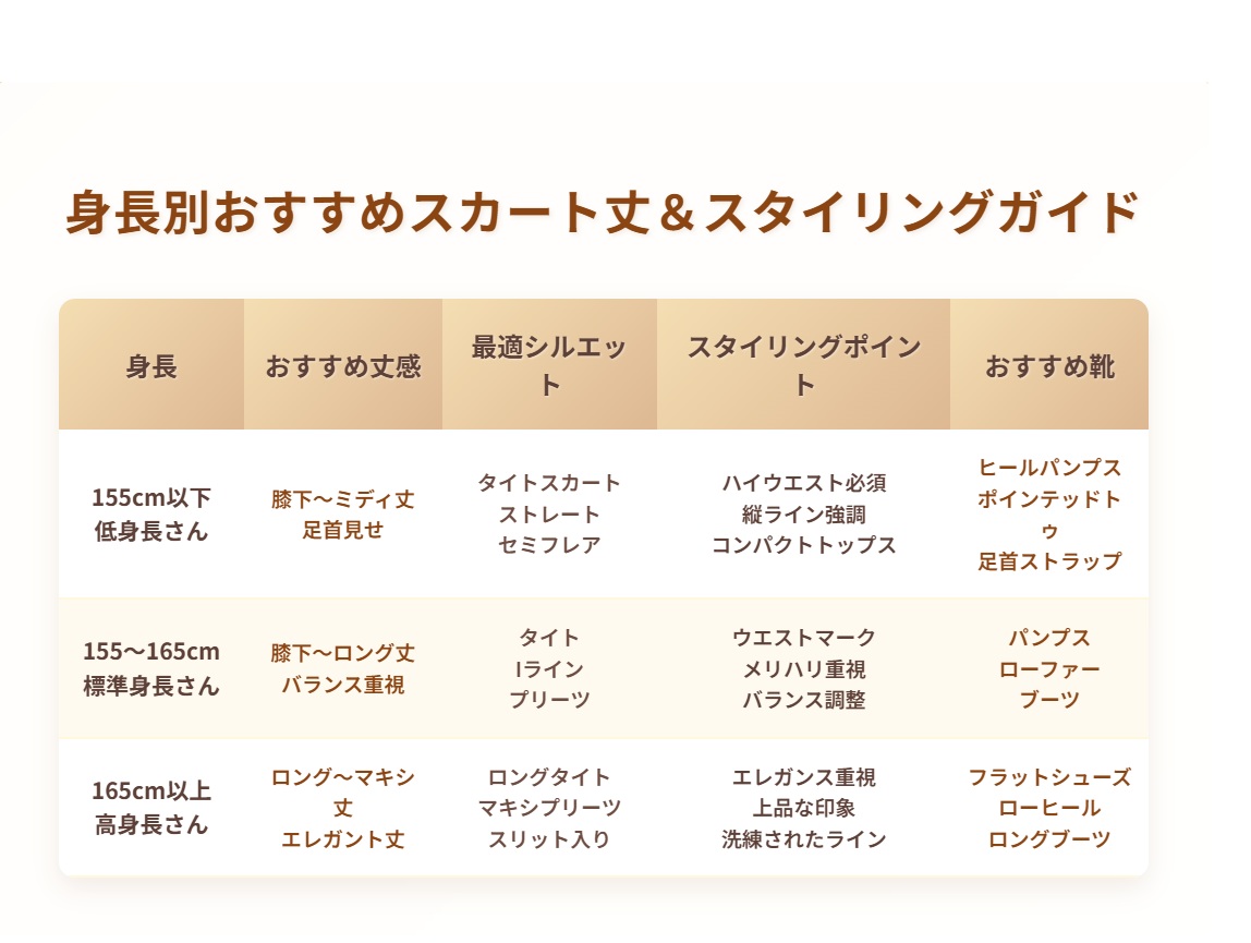 表1:身長別おすすめスカート丈&スタイリングガイド