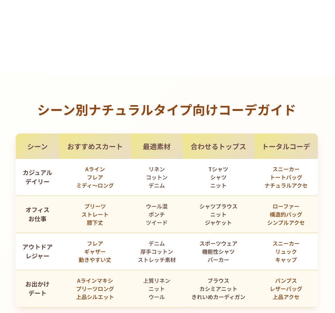 骨格ナチュラルタイプの方がスカートを美しく着こなすためのポイントは、ナチュラル素材の選択、自然なシルエットの活用、そしてシンプルで機能的なデザインの重視でしたね。