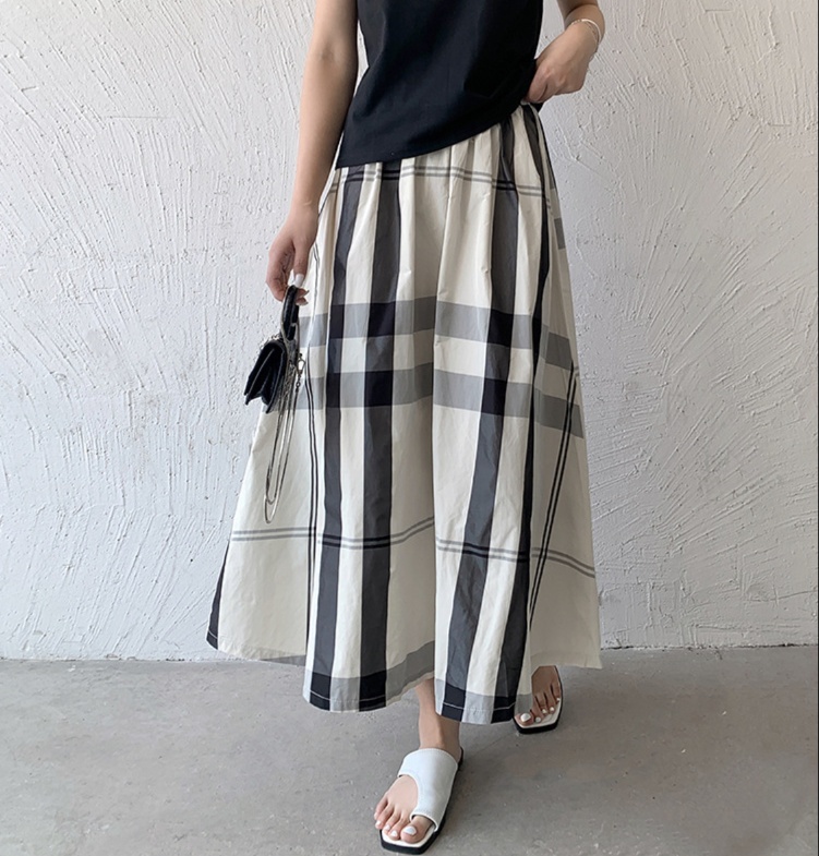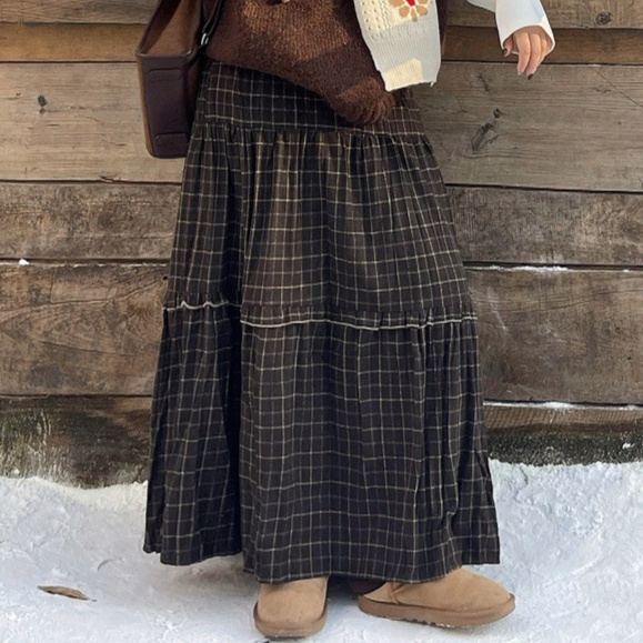 4. トレンド感溢れる大人カジュアル!ギンガムチェック柄ティアードロングスカート