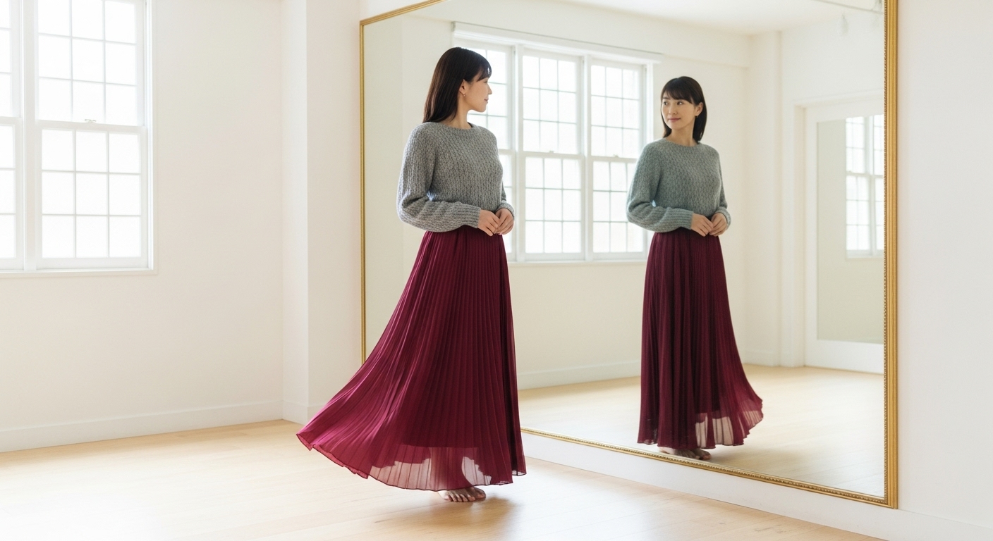 プリーツスカートの丈選びに迷ったら、ロング丈を選んでおけば間違いありません!