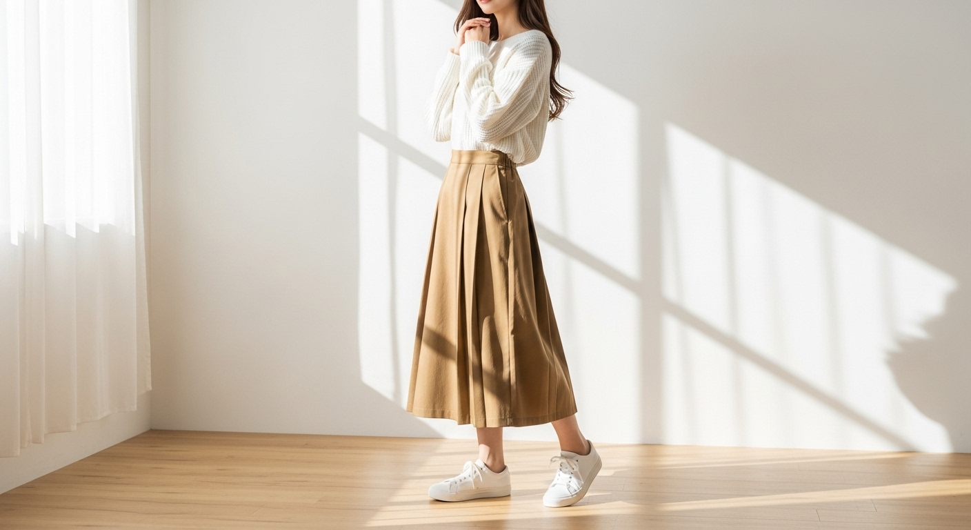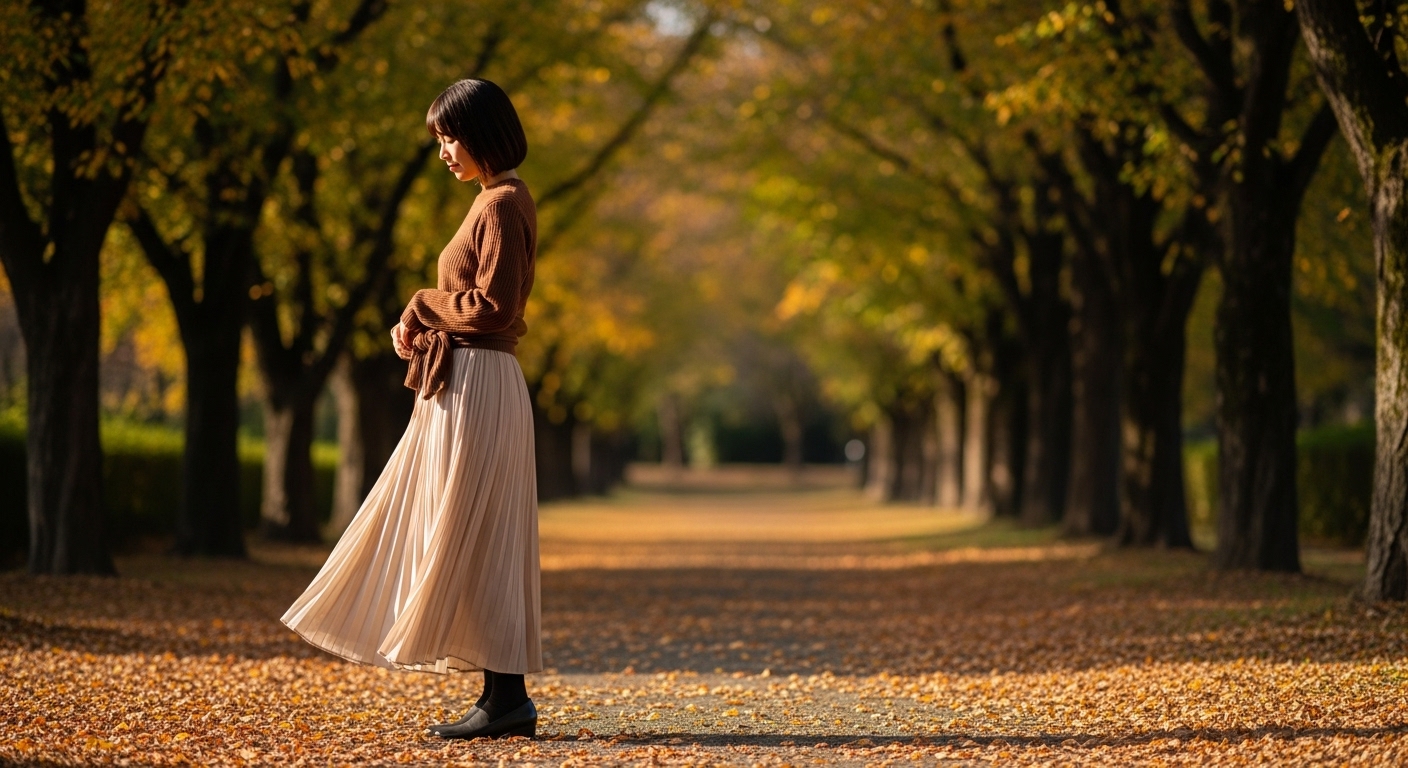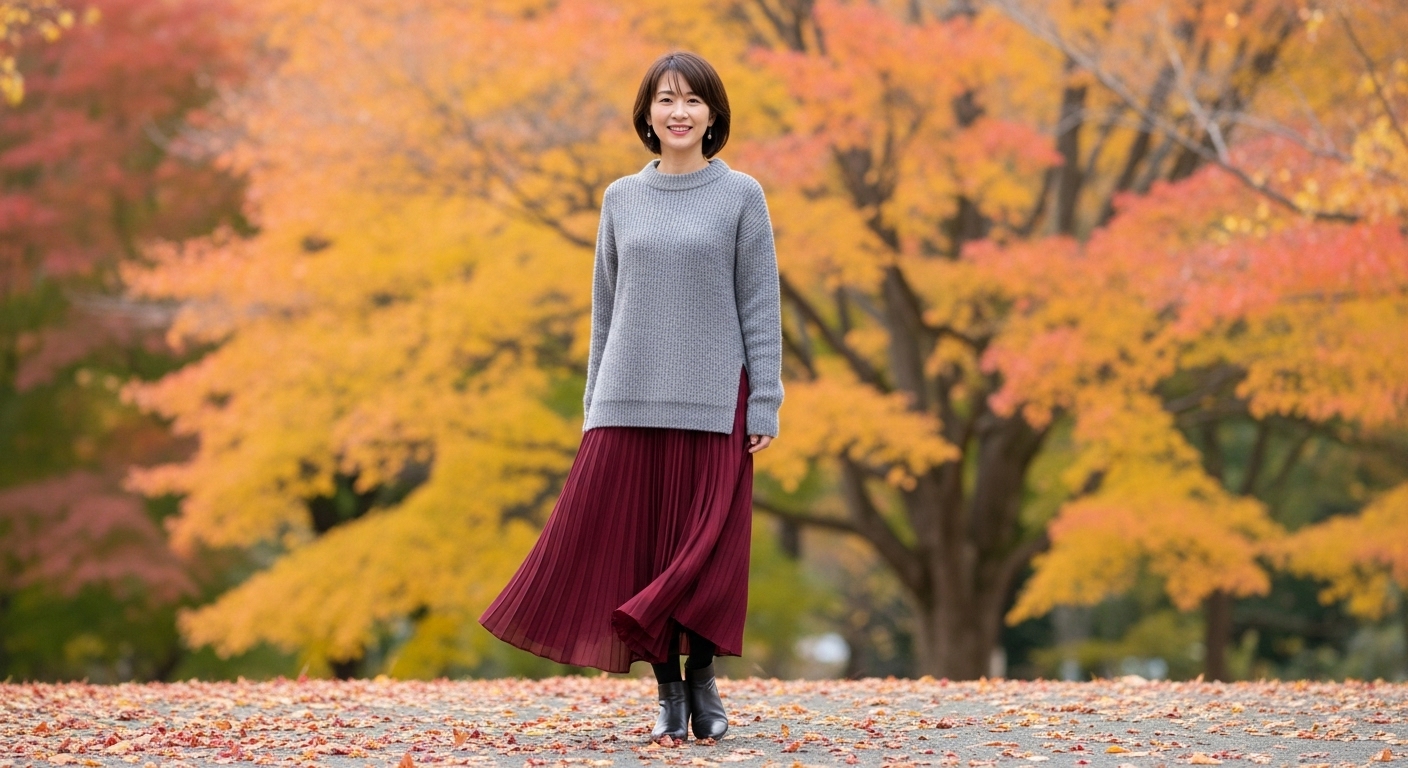 プリーツスカートは、色と素材を工夫すれば、秋の万能アイテムになります。