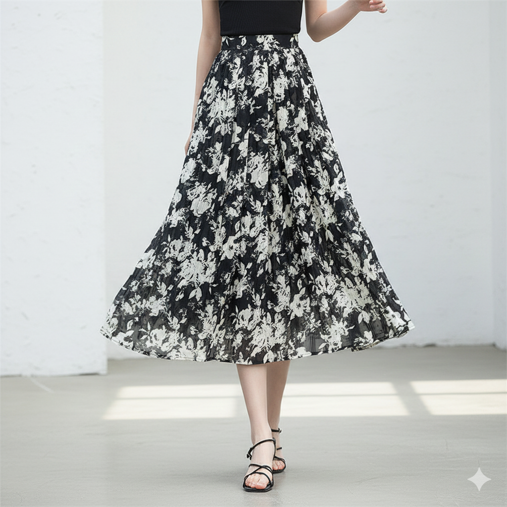 このスカートの魅力は、長時間の観光でも疲れにくい軽やかな素材感と、体型カバーしながらも女性らしいシルエットにあります。