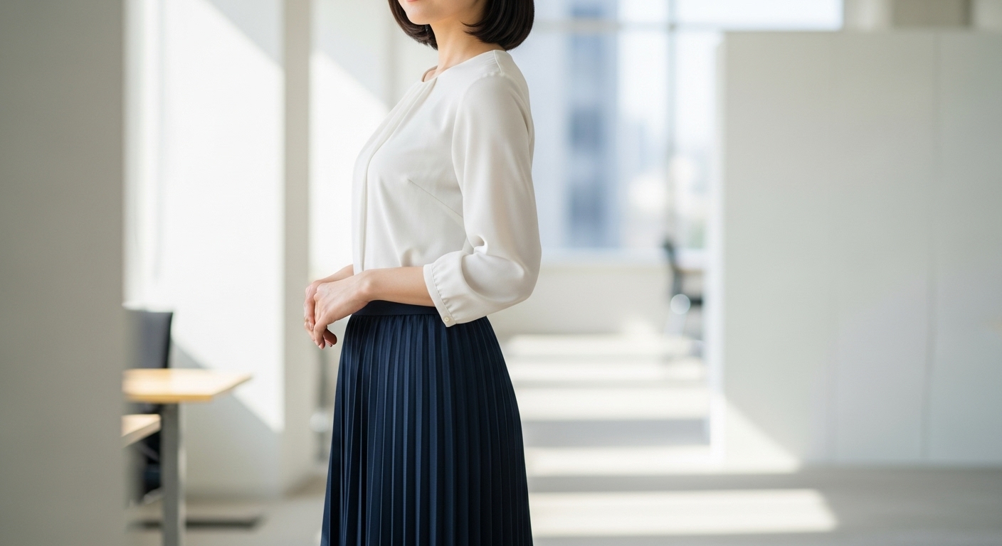 白やベージュのシアートップスに、ネイビーやグレーのプリーツスカートを合わせれば、爽やかで上品なコーディネートになりますよ。