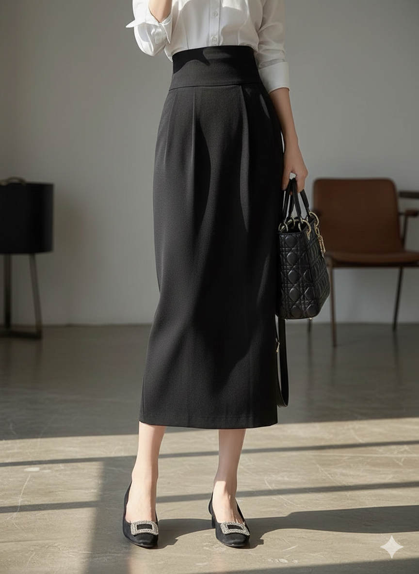 女性らしい曲線を美しく見せながらも、裾の広がりが歩きやすさを確保してくれます。