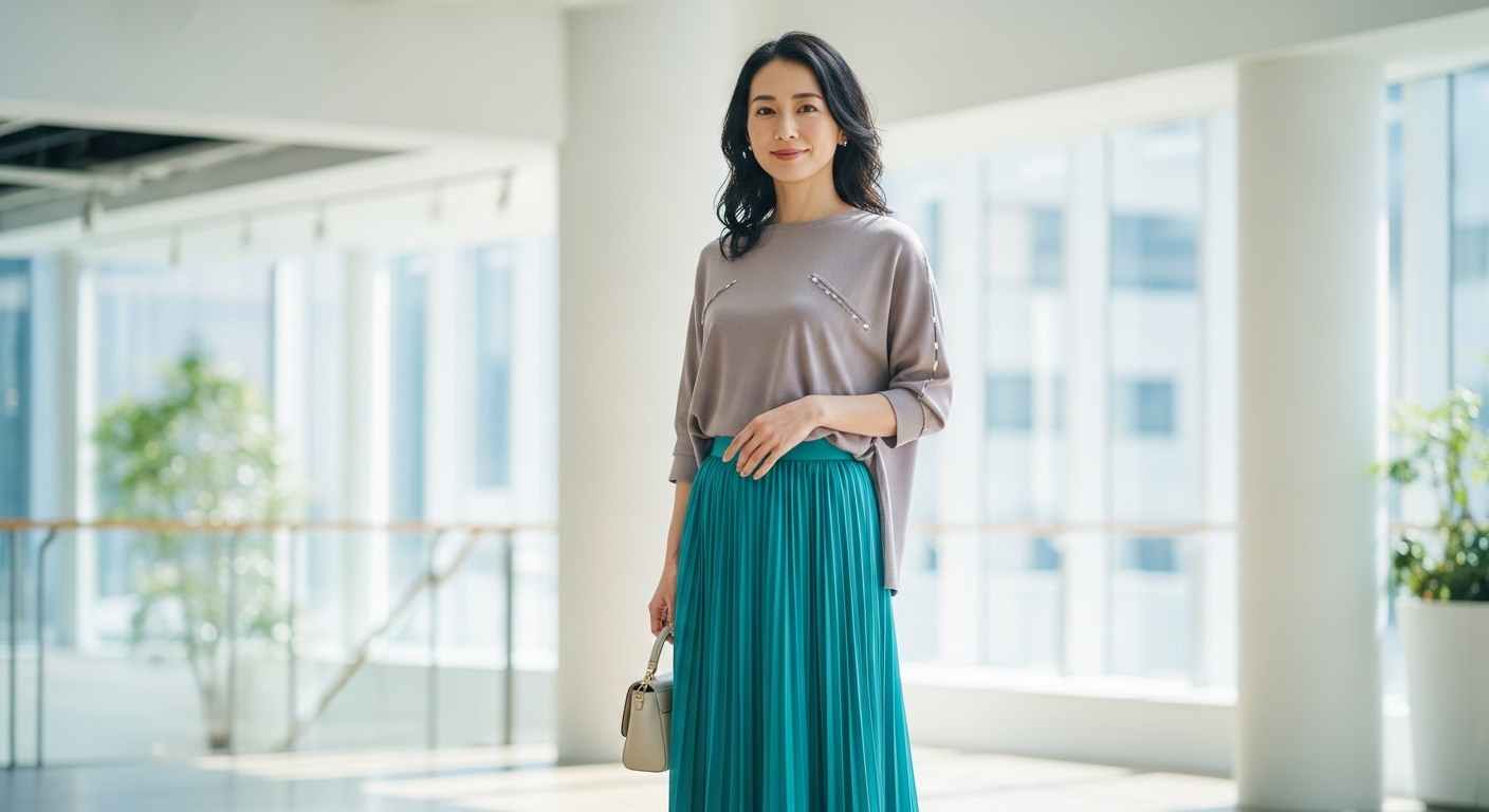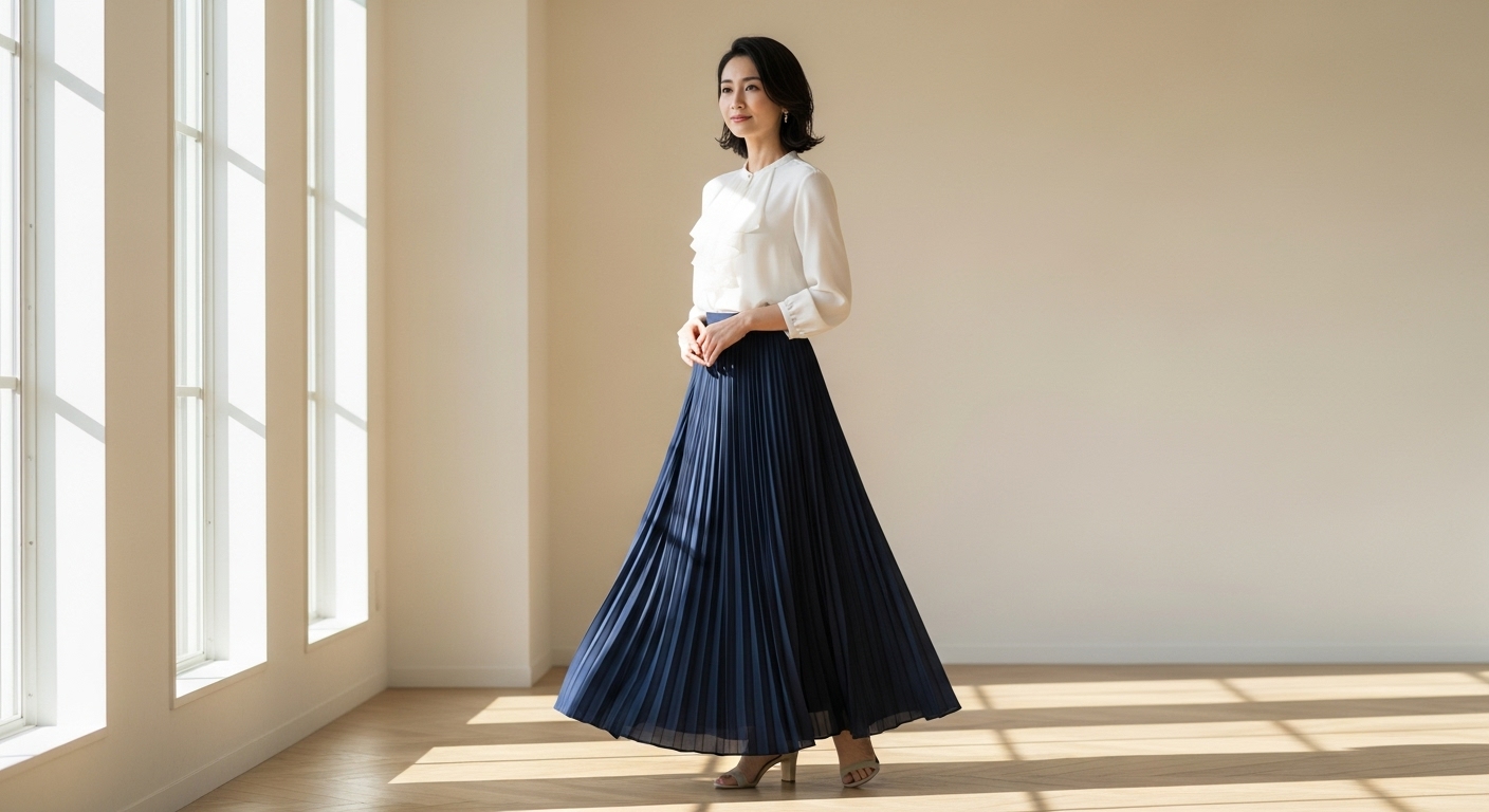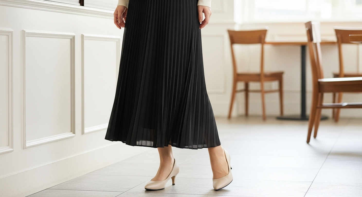 プリーツの縦ラインが視線を上下に導くことで、自然と背が高く見えてスタイルアップ効果が期待できます。