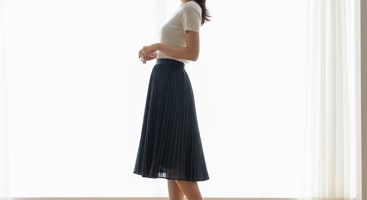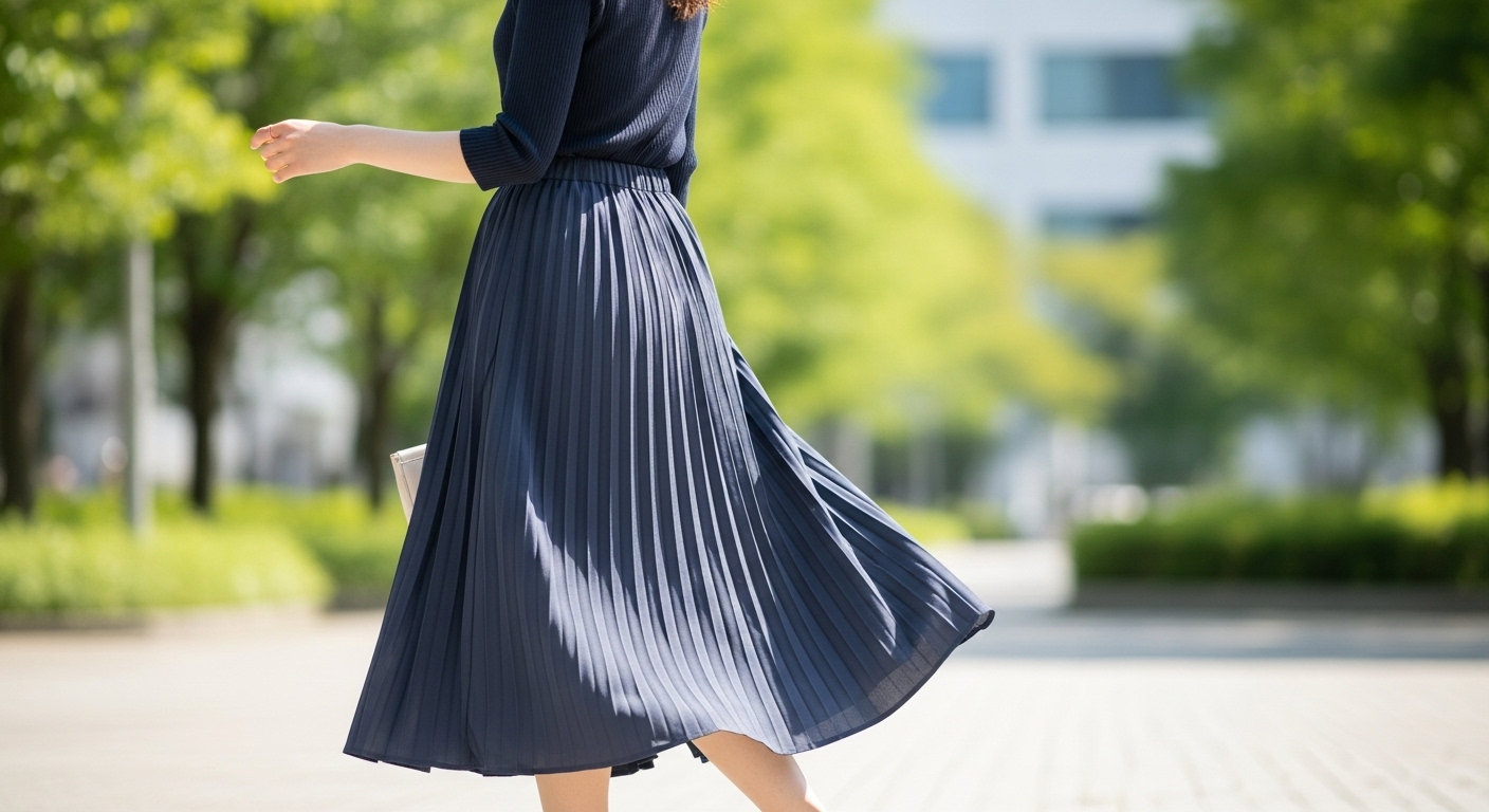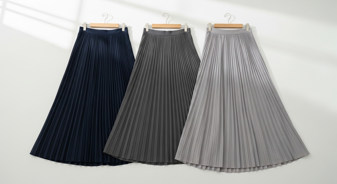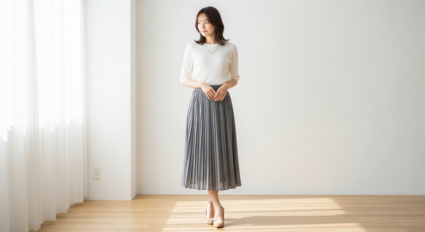 まずは1着、ネイビーまたはグレーの細プリーツ・ミモレ丈から始めてみましょう。