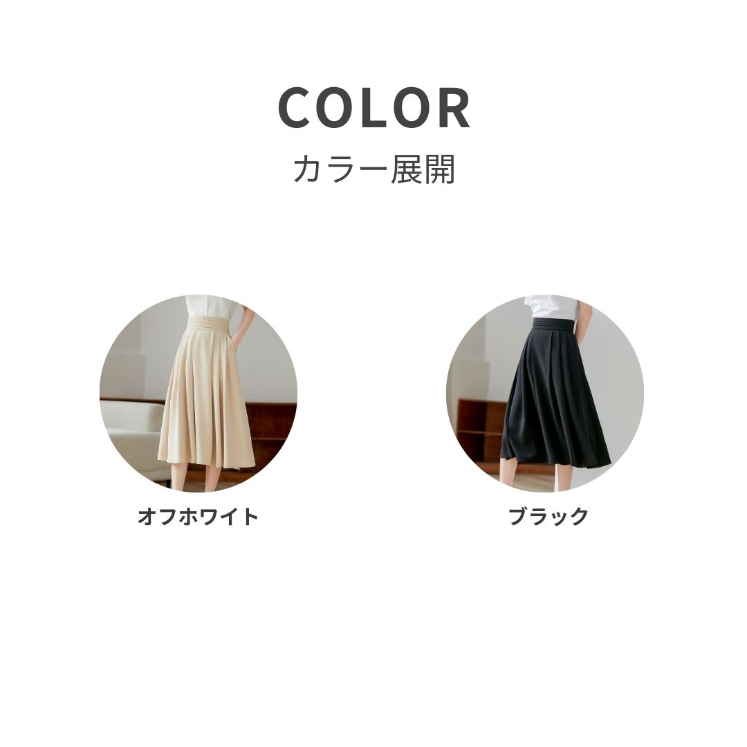 程よい広がりのフレアデザインが腰まわりを自然にカバーしながら、歩くたびに上品な揺れ感を演出。体のラインを拾わず、立ち姿も動いている時もすっきりと女性らしい印象をキープできます。オフィスにもプライベートにも対応する万能なシルエットが、朝のコーディネートを迷わせません。